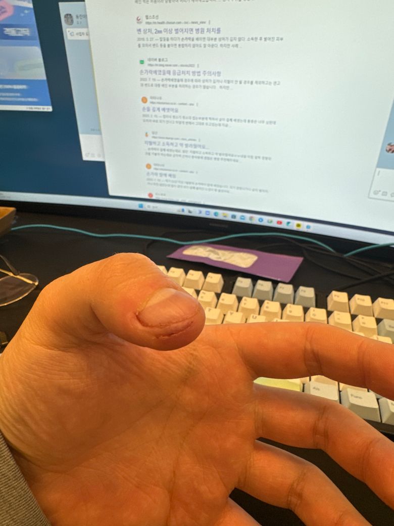 다만 엄지손가락만 감각이 조금 다르고, 손가락 안이 멍든것처럼 아픕니다.
