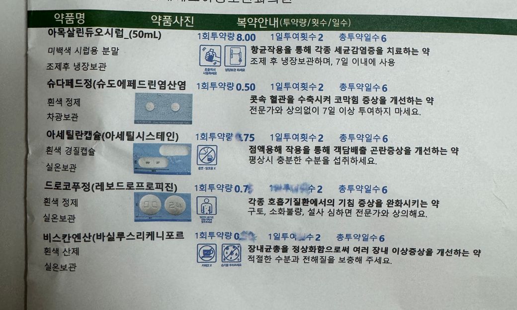 위 사진이 첫째 약 처방전 인데요, 둘째도 감기약을 먹은 상태로 첫째꺼 까지 같이 먹었는데 이상이 없을까요? 처치를 어떻게 해애 할지 모르겠메요