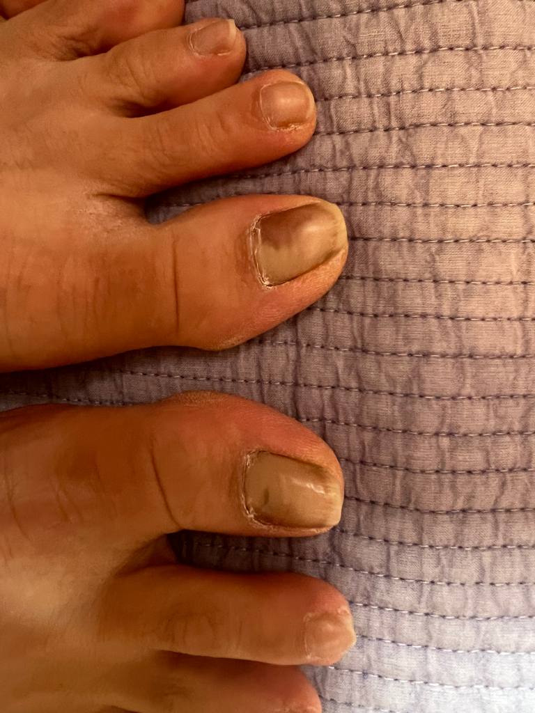 조갑하혈종의 가능성이 있어보입니다. 이는 외상이나 충돌에 의해 혈관이 파열되어 혈액이 아래로 모이는 현상입니다. 일반적으로 통증과 종양, 혈종 부위의 부어오름과 같은 증상이 나타날 수 있습니다.