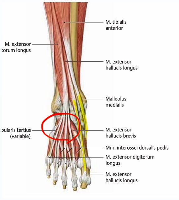 표시한 부위는 주로 Extensor digitorum longus tendon이나 Tibialis anterior tendon이 지나가는 곳이라 행군 후 "힘줄 염증(과사용)"이 생겼을 가능성이 있습니다.