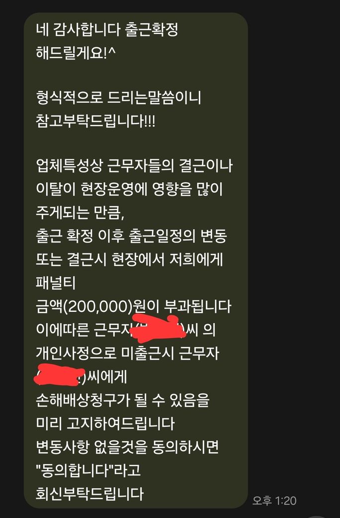따라서 사전에 결근시 손해배상 하겠다는 약정에 동의하셨더라도 효력은 없습니다.