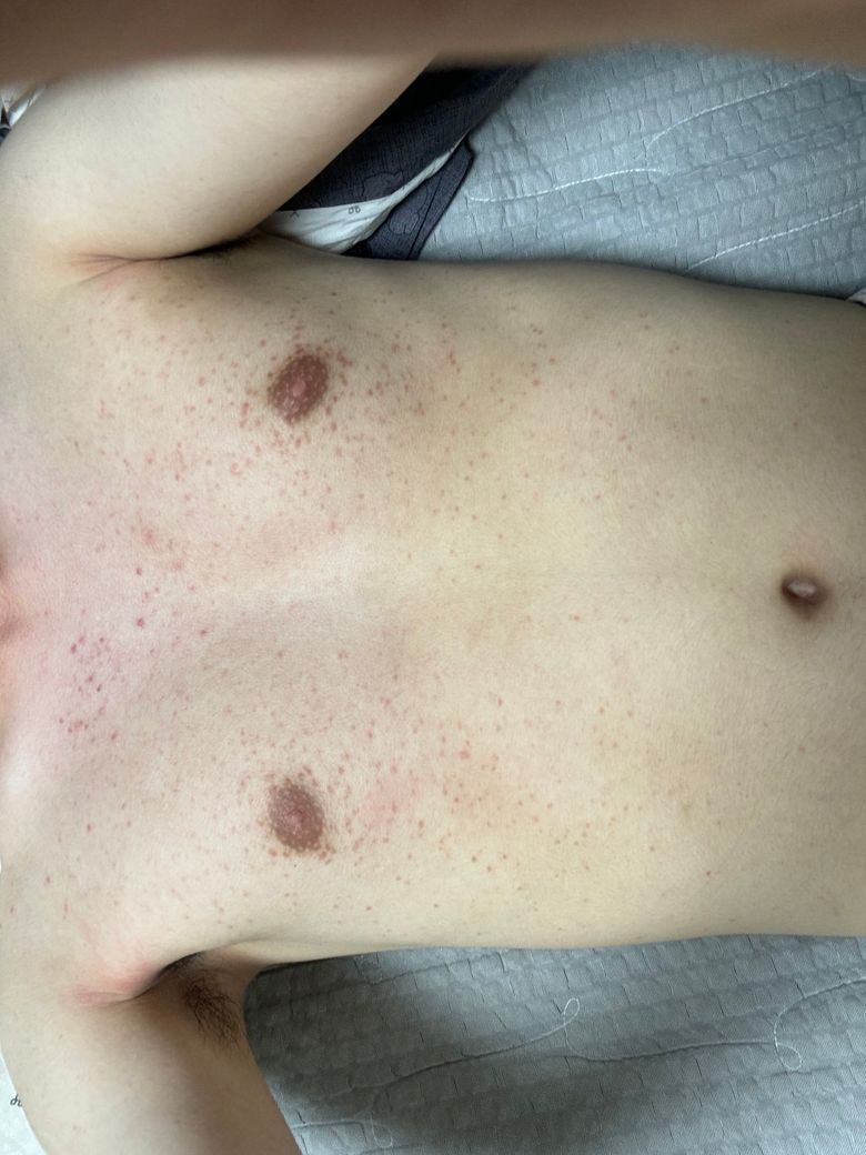 사진과 같이 몸에 갈색 점과 같은 병변이 몸에 많이 나있습니다. 처음에 피부과에 갔을 때는 모낭염이라고 하여 여드름관련 약을 1년째 먹는데 효과가 없고 더 퍼지는 것 같습니다. 제가 인터넷에사 찾아본 결과 편평사마귀나 모공각화증이 가장 가까운 것 같은데 어떤 것인지 알려주세요