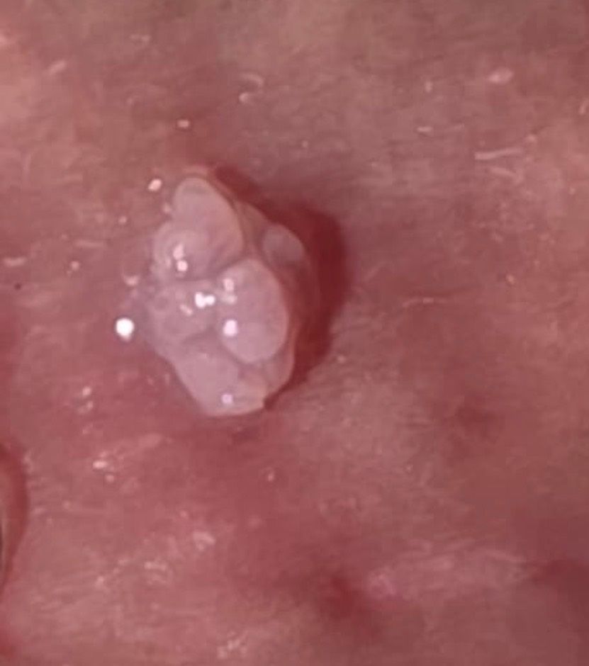 사진 소견상 표면이 매끈하고 물집처럼 투명한 결절이 모여 있는 형태로 보이며, 전형적인 곤지름(콘딜로마)의 소견과는 다소 다릅니다. 곤지름은 대개 표면이 거칠고 꽃양배추처럼 불규칙한 돌기 형태를 보이며, 개별 병변이 퍼지거나 다발성으로 증가하는 양상이 흔합니다. 반면 현재 병변은 비교적 국한되어 있고 표면이 비교적 매끈한 편이라 쥐젖(연성섬유종) 또는 피지선/피부낭종 계열 병변 가능성이 더 우선 고려됩니다.