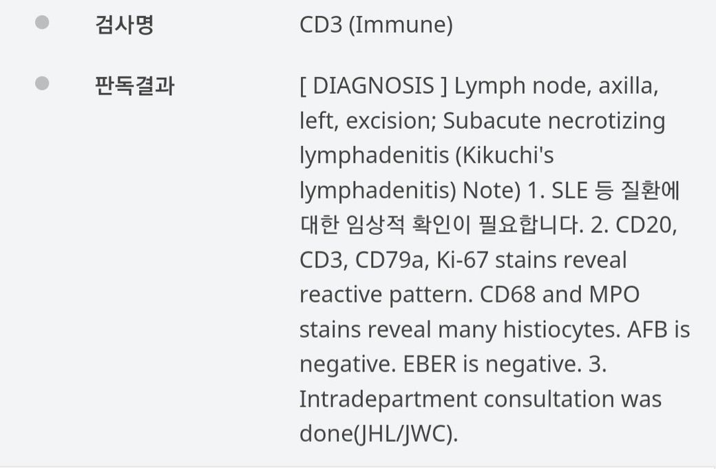 안녕하세요. 전 39세 세아이 엄마이며, 직장에 다니고 있습니다. 11월 7일 갑작스럽게 열이 나기 시작하더니 3주이상 열이 지속되었으며 임파선이 붓고, 2주 사이에 체중이 4키로 감소된 상태여서 대학병원에서 정밀검사가 필요하다고 판단하여 입원해서 CT촬영, 임파선 조직검사 등 여러가지 검사가 이루어진 결과 기쿠치병이라고 하셨습니다. 다행이 염증이였다고 하시더라구요.. 아래사진이 그 결과입니다.