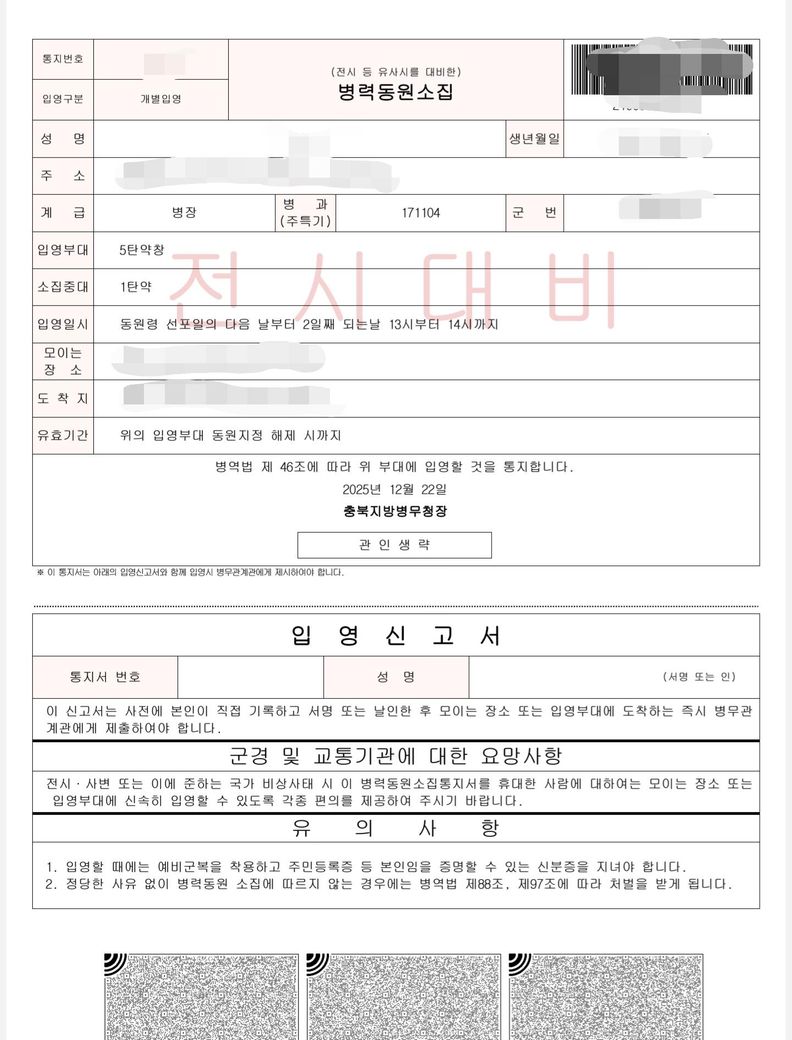 한마디로 전쟁나면 통지서에 적힌 입영부대(5탄약창)로 날짜와 시간 맞춰 입영해라 입니다