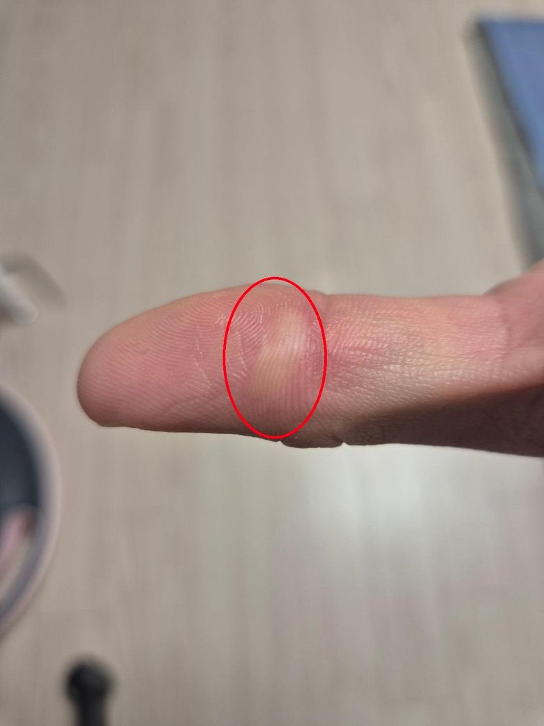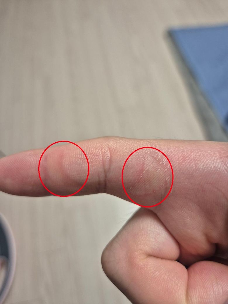 사진상으로는 수포가 크지 않고, 피부가 벗겨지지 않은 상태로 보이며 얕은 2도 화상(표재성 부분층 화상) 가능성이 높습니다. 통증이 심하지 않은 점도 깊은 화상 가능성은 낮아 보입니다.