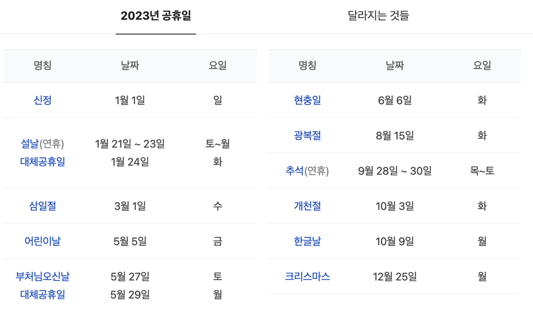 2. 2024년의 경우 공휴일 15개 + 대체공휴일 2개로 총 17개의 공휴일이 있습니다.