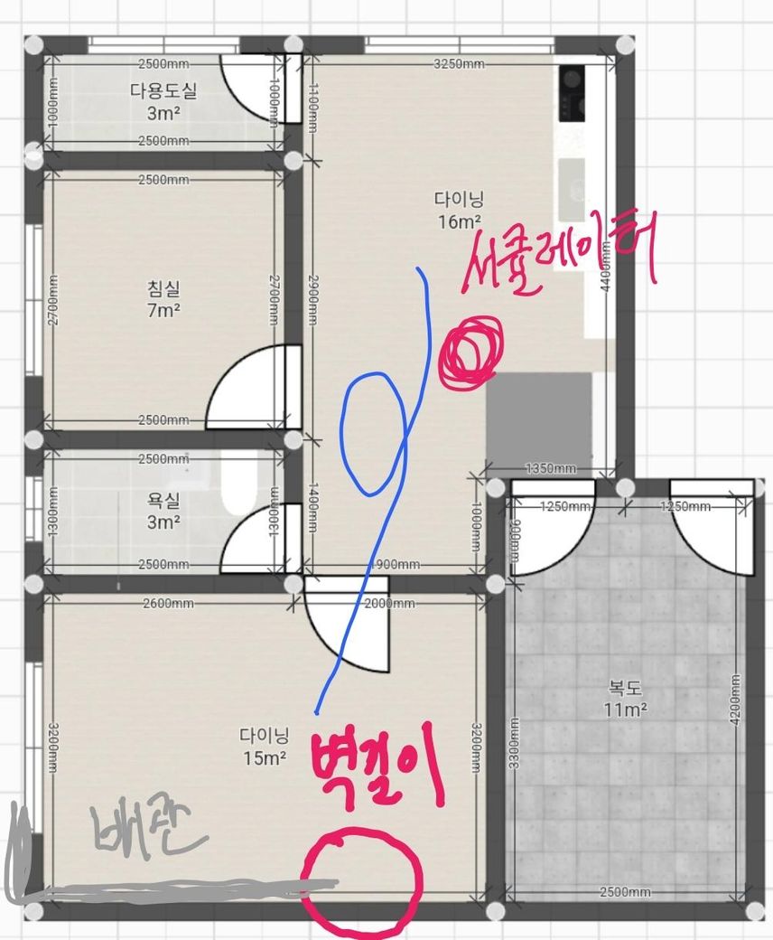 지금 말한 다이닝 공간이 아니라 우측 상단에 있는 다이닝 공간에 설치를 하게 된다면 주방의 온도를 쉽게 잡으면서 집에 구석 구석 퍼질 수 있는 좋은 공간입니다.