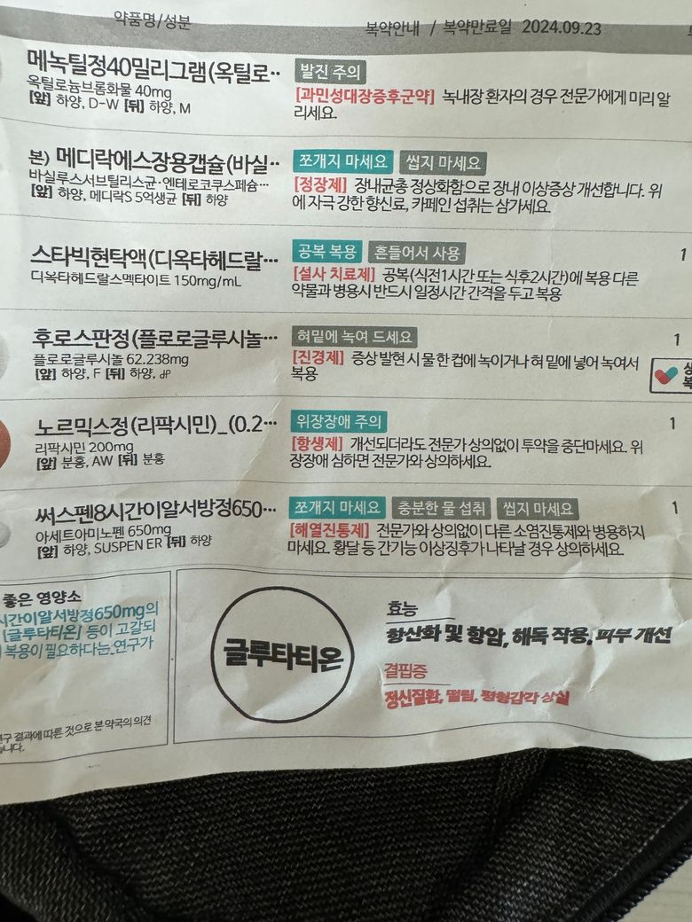 *처방받은 약 : 메녹틸정 / 메디락에스장용캡슐 / 스타빅현탁액 / 후로스판정 / 노르믹스정 / 써스펜8시간이알서방정