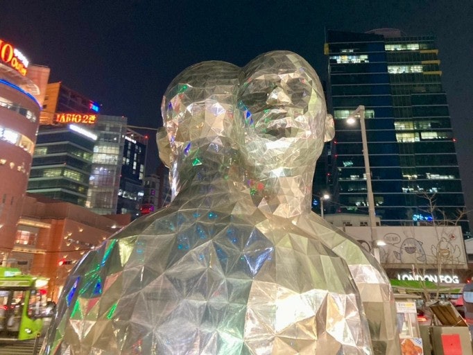 찾아보니 이진준 작가의 they 그들이라는 작품이라고 합니다. 한쌍의 남녀가 포옹하고 있는 모습이라고 하네요. 여자는 하늘, 남자는 땅을 보고 있는데, 현대 사회의 소통이 점점 멀어지는 현상을 보고 서로가 함께 꼭 껴안아야할것이라는 메세지를 전달하고자 했다는 것으로 알려져 있습니다.