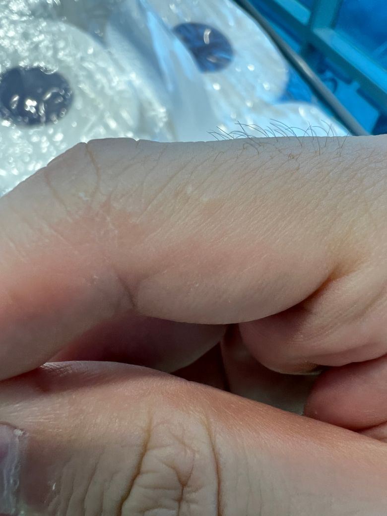 올려주신 사진으로 미루어 한포진의 가능성이 생각되나 가려움증 동반이 없다면 피부과 진료를 권합니다.