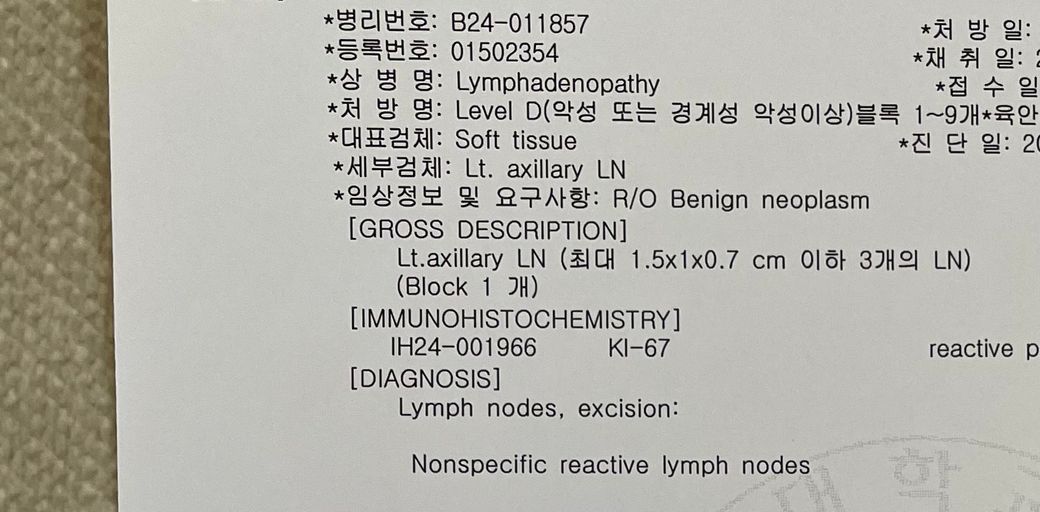 부어서 CT MRi찍고 사타구니쪽도부어있대서삼개월지나고 다시초음파했으나 크기가그대로라 수술해서 겨드랑이조직검사를했어요 별거아니라고말씀하시고 일년뒤에오랬는데 정확한원인은 찾지못했어요 ㅠㅠ 더검사할필요는없나요?왼쪽에서조직검사나갔고 현재는 우측겨드랑이가 콕콕쑤시는정도입니다
