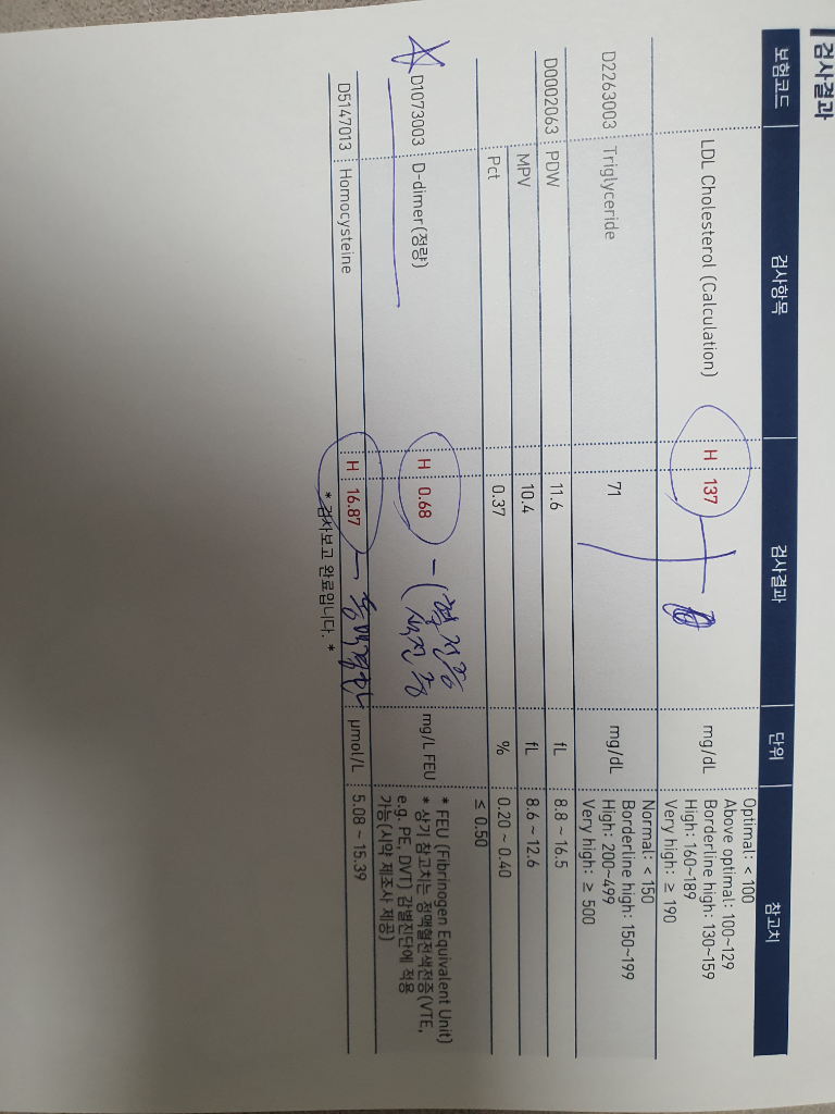 그리고 나서 3주전 운동하다 발목을 다처 기부스를 3주동안 하고 누워만 있다보니 혈전이 생길 것 같아 동네 내과에서 혈전 검사(디다이머 피검사)를 했는데