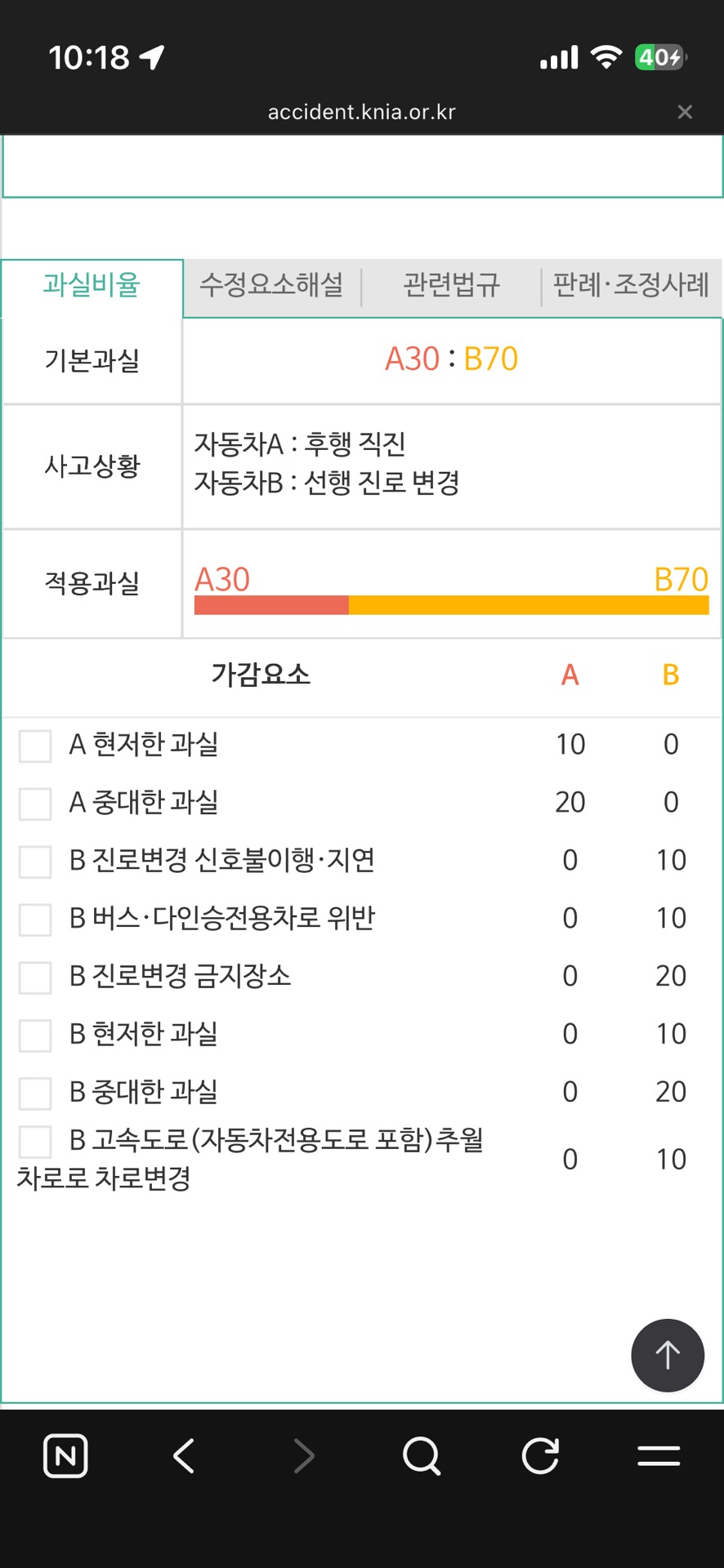 여기에 급차선변경이나 실선차선변경, 방향지시등 미점등 등 사고상황에따라 추가 과실여부가 달라지게 됩니다.