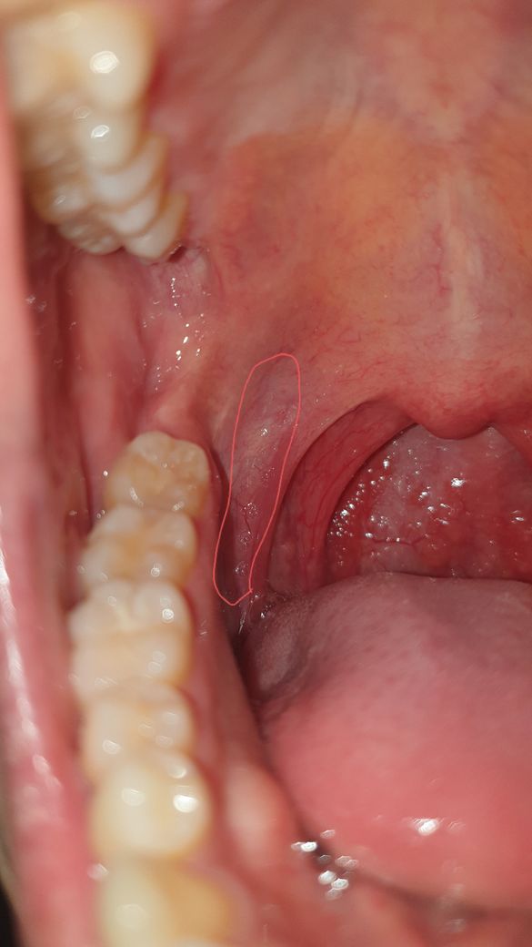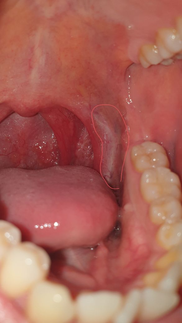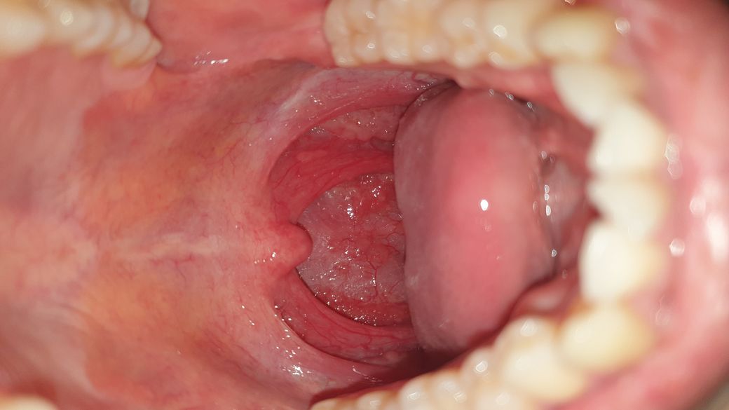인후부를 사진으로 보았을 때 인후 발적과 함께 왼쪽 편도가 조금 부어 있지만