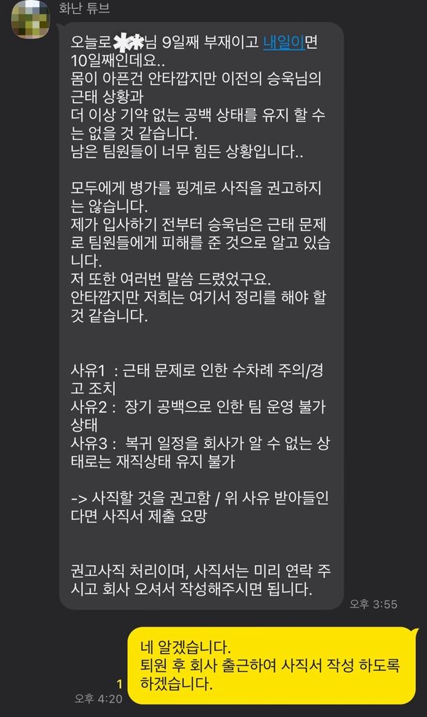 현재 입원중으로 출근을 10일 이상 못하고 있으며 근태 문제로 사진과 같이 권고사직을 당하였는데 실여급여에 대해 수령이 가능할까요?