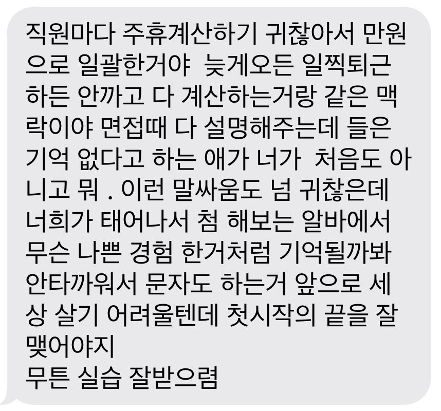 그래서 저는 애초에 근로계약서도 안썼고 알바몬 공고에도 주휴수당포함 시급 10,000원이라는 말이 없었으며 저랑 제 친구도 면접볼때 시급에 포함되어있는지도 몰랐다라고 보냈더니 “문자하기 귀찮은데 왜 전화 안받니” 라는 답변을 받아서 실습때문에 교육받고있어서 전화를 못받는다 라고 했습니다. 그 뒤로 점장님께서는 사진과 같은 말을 남겨주셨습니다.