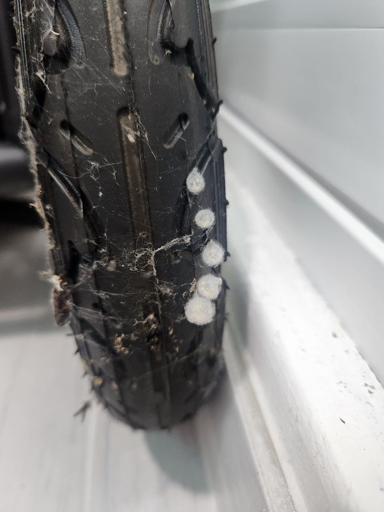 집안 유모차 바퀴에 하얗게핀것은 거미 알이나 나방
