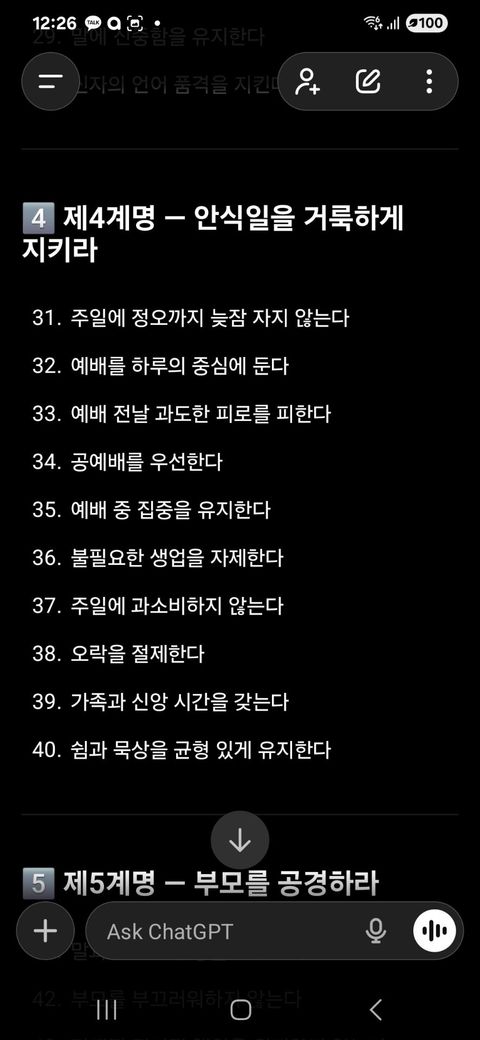 성경적 본질은 하나님과의 관계, 쉼 예배, 공동체 배려에 초점이 맞춰져 있으므로, 10가지 실천 항목으로 나누는 해석은 참고 자료로 활용할 수 있으나, 성경의 핵심 의미를 왜곡하지 않는 범위 내에서 적용하는 것이 바람직합니다.