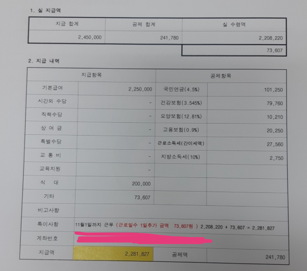 11월1일자 근무일수 1일추가 금액이 맞지않는것같아서 올려봅니다.