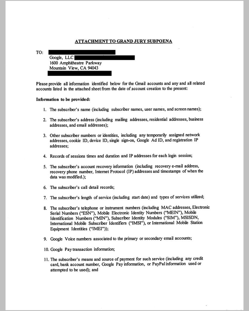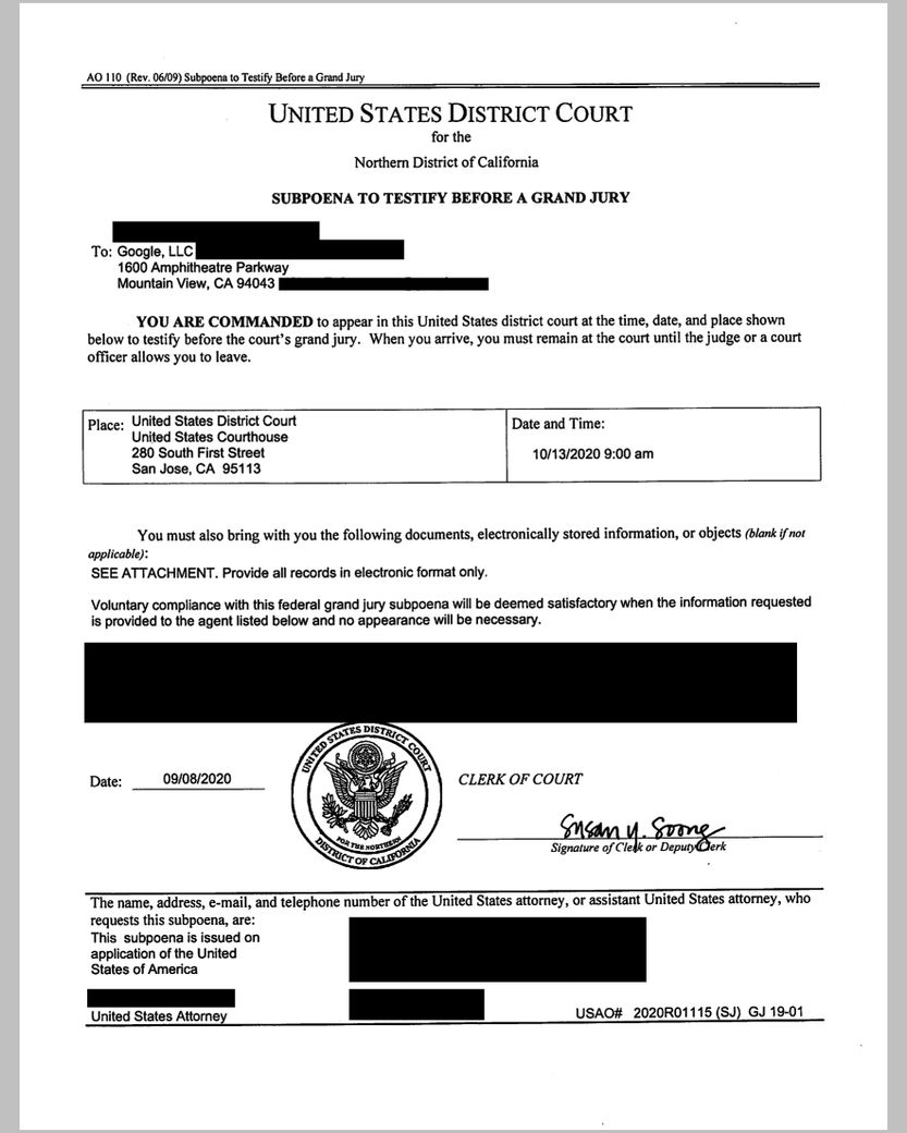 다름이아니라 몇일전 Google측에서 지난 2020년 경 DHS의 요청에 의해 Northern District of California court 에서 발부된 영장을 근거로 제 개인정보(이름,주소,전화번호등을 포함한 민감한 정보) 들을 제공 하였음을 알려왔습니다.
