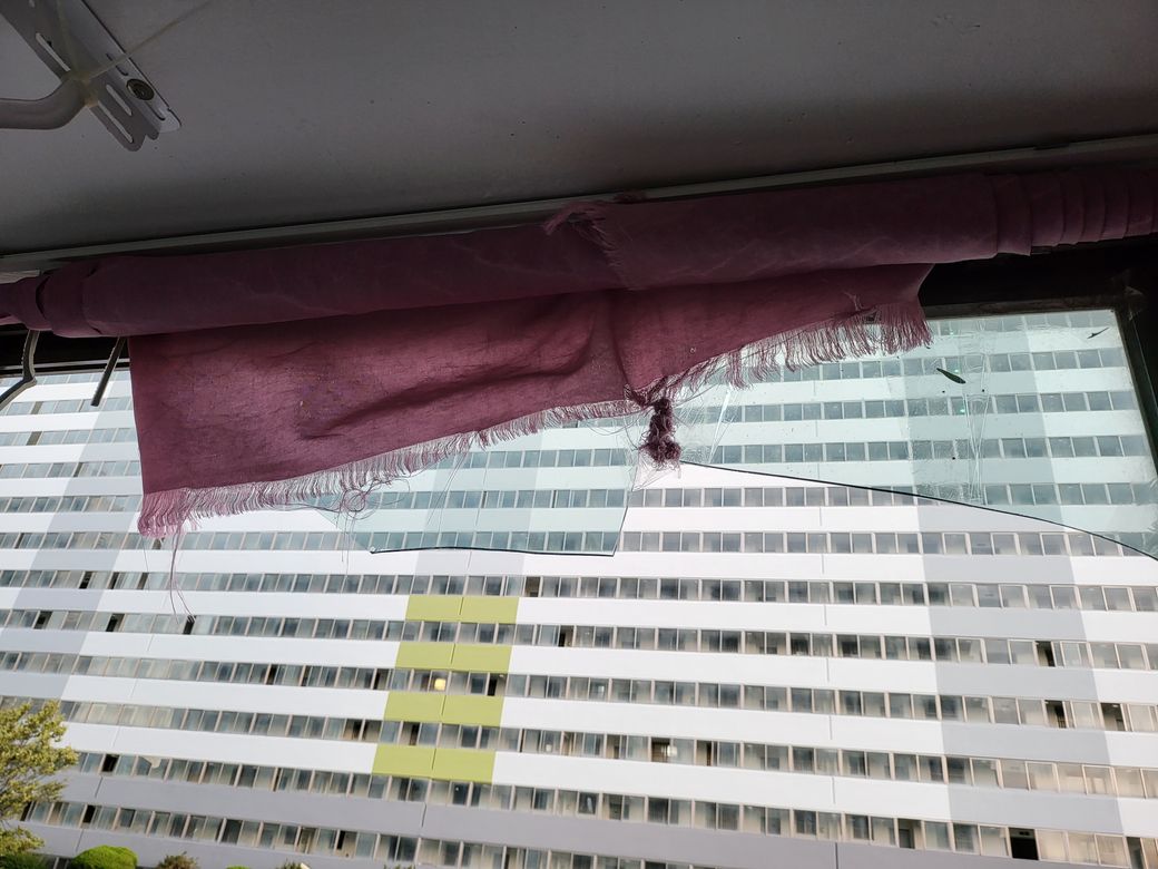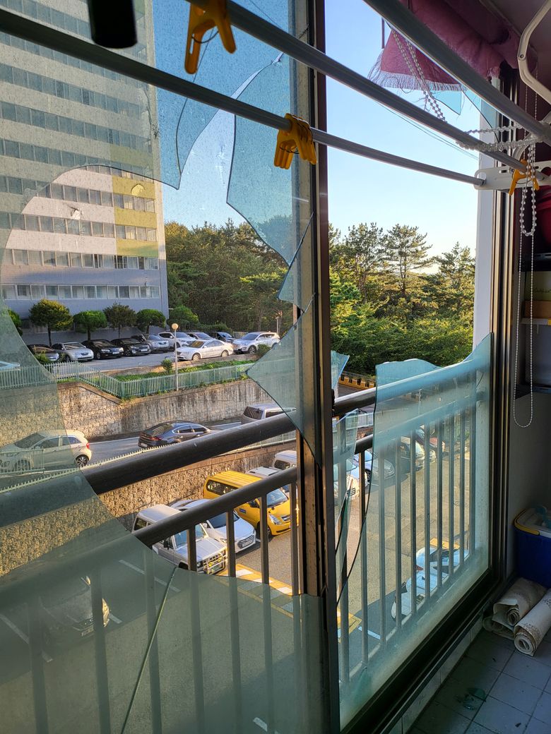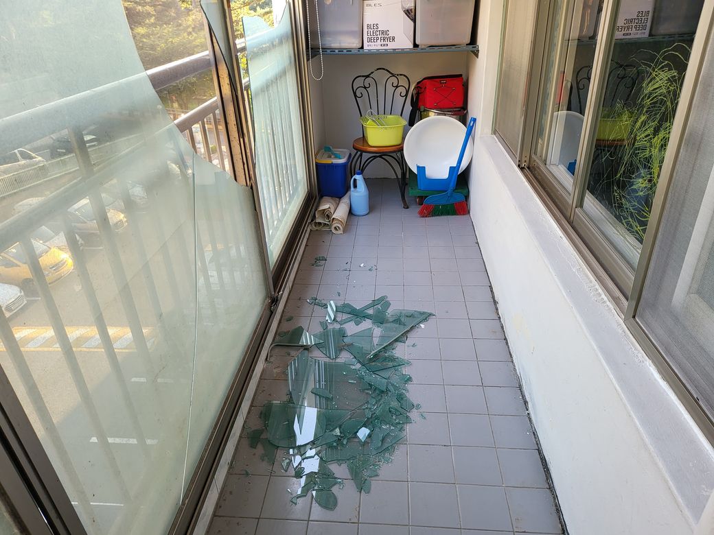 태풍으로인하여 베란다 창문 두장이 깨어지고 샸시가 전체적으로밀려 샷시 상단 부분이 굽어져 있었습니다(샷시 업자분은 조심스레 따로 저에게 임차인이 창문을 열어본거같다 라고 하셨습니다) 방문을 해보니 샷시 아랫부분에만 신문지 같은것을 한장 끼워 두었고 문틀이나 유리에 테이프를 붙히거나 젖은 신문을 바르는 행위는 없었고 추가 피해를 막기위한 어떠한 조치도 하지않아 아래에서 이러한 사실을 모르고 화단에서 경비아지씨께서 작업을 하고 계시는것을 보고 놀라 제가 위에 세대가 창문이 깨졌어니 위험하니 빨리 밖으로 나오시고 차량 주차를 막아달라고 하였어며 철거를 위해 사람이 오는 시간동안 추가 피해를 막고자 테이프로 금이간 유리부분과 창틀 부분을 붙혀 두었습니다
