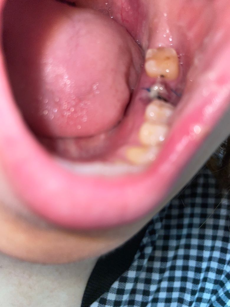 현재 사진상으로 해당부위가 잘 아물고 있는 것으로 보이기에 크게 문제가 되지는 않습니다. 음식물 찌꺼기가 남지 않도록 충분히 가글하여 관리하여 주길 권합니다.