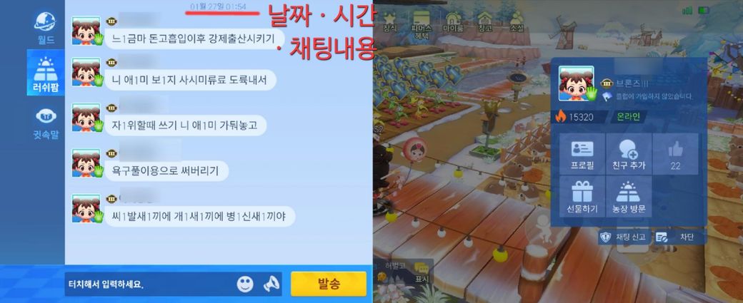 당시 저는 혼자 농장에 있었고, 그 채팅을 다른 유저들이 실시간으로 볼 수 있는 상황은 아니었습니다.