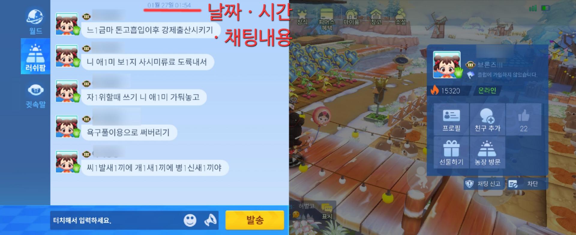 해당 가해자는 저와 대화를 나눈 적도 없고 아무런 접점이 없는 관계였으며, 카러플 게임 내 제 개인 공간인 ‘러쉬팜(농장)’에 갑자기 방문하여 공개 채팅창을 통해 첨부한 사진과 같이 입에 담기 어려운 수준의 욕설을 남긴 뒤 곧바로 사라졌습니다.