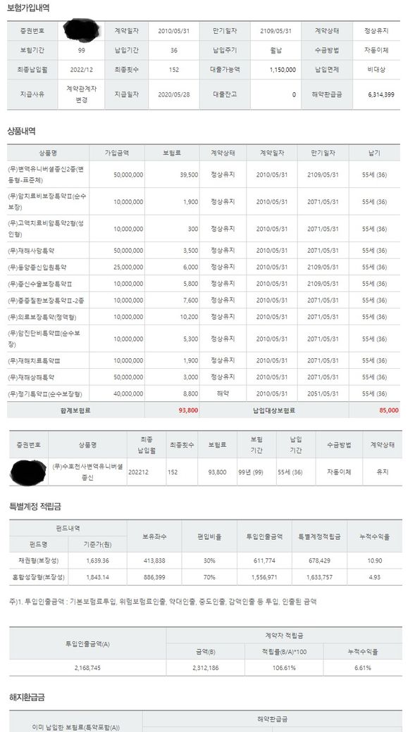 다행히 모두 수익 발생이 되었네요. 주계약부분만 제외하고 기납입보험료에서 원금도달 만들면 그때 다시 고민해도 되겠습니다.