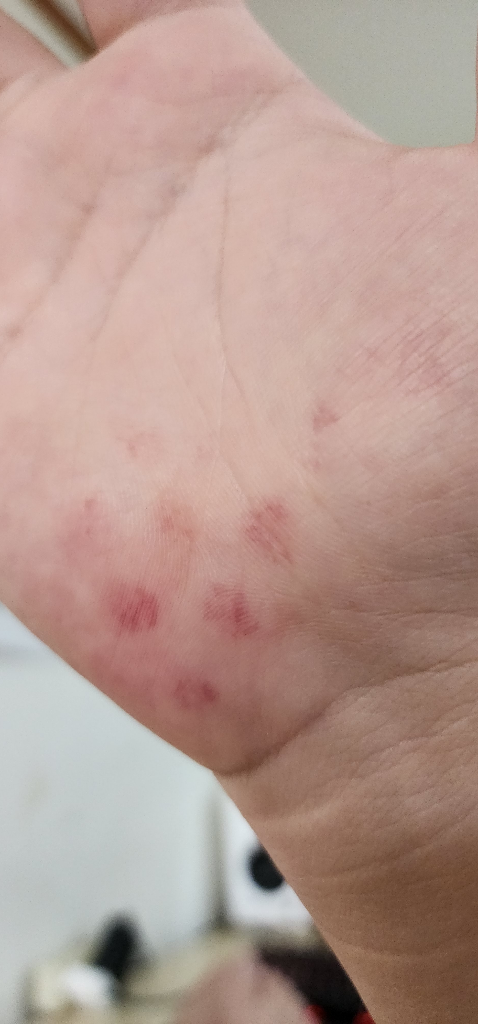 오늘 아침에 일어났는데 손바닥에 둥근 피같은게 생겼어요ㅠㅠ. 위로 튀어나오진 않는거같은데 만지면 조금 아파요.. 이게 뭘까요?