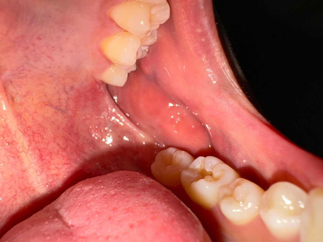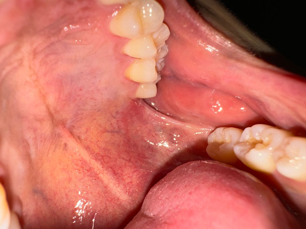 5개월 전에 충치 땜빵할게 있어서 치과갔을 때 입을 크게 벌리면서 익돌하악봉선이 갑자기 엄청 땡기면서 그 부분이 찢어지고 상처가 났었는데 거기랑 이어지는 어금니 뒤쪽 사랑니 나는 자리에 흰색 뾰루지같은게 세개정도 나있어요. 크게 아프진 않고 신경 쓰일 정도로 쓰라린 정도인데 뭘까요? 한 3일정도 됐고 익돌 하악봉선쪽에 찢어진건 5개월 됐습니다. 두달정도 전에 치과갔을 때는 구강암같은건 아니라고하시고 연고 주셔서 며칠 바르니까 완치는 아니고 거의 나았었는데 이게 또 재발한걸까요? 사진상으로 심각한 병으로 보이시나요? (참고로 저 부위에는 사랑니가 없습니다.)