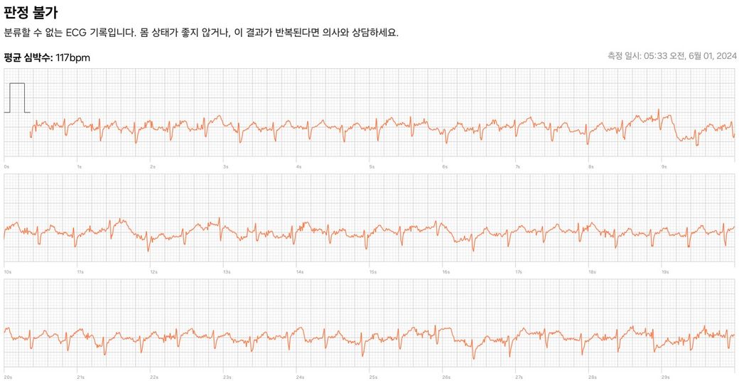 워치의 ECG 기록에서 보이는 심전도는 노이즈가 심하여 정확히 판별하기가 어렵습니다.