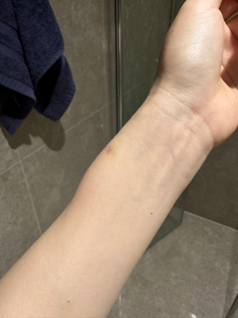 수액이 조금 새어나갔던 것으로 보입니다. 당시 통증이 있었을텐데, 참고 계셨을수도 있습니다. 당장은 해당 부위에 감염증이 의심되지는 않으니 혹시나 붉어지고 열감이 느껴진다면 병원을 방문해보시고 지금은 진통제 복용하고 붕대로 가볍게 압박하며 지내보시기 바랍니다.