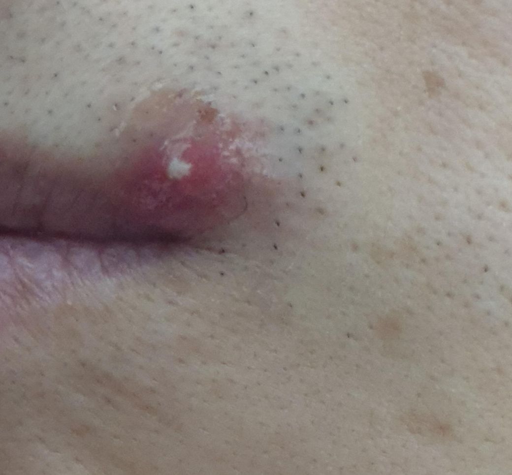어금니 치실하다보니 입술옆이 쏠려서 조금 붓더니 현재 저렇게 되었어요. 붉은부위가 좀 솟아올랐고요.하얀건 고름인가요