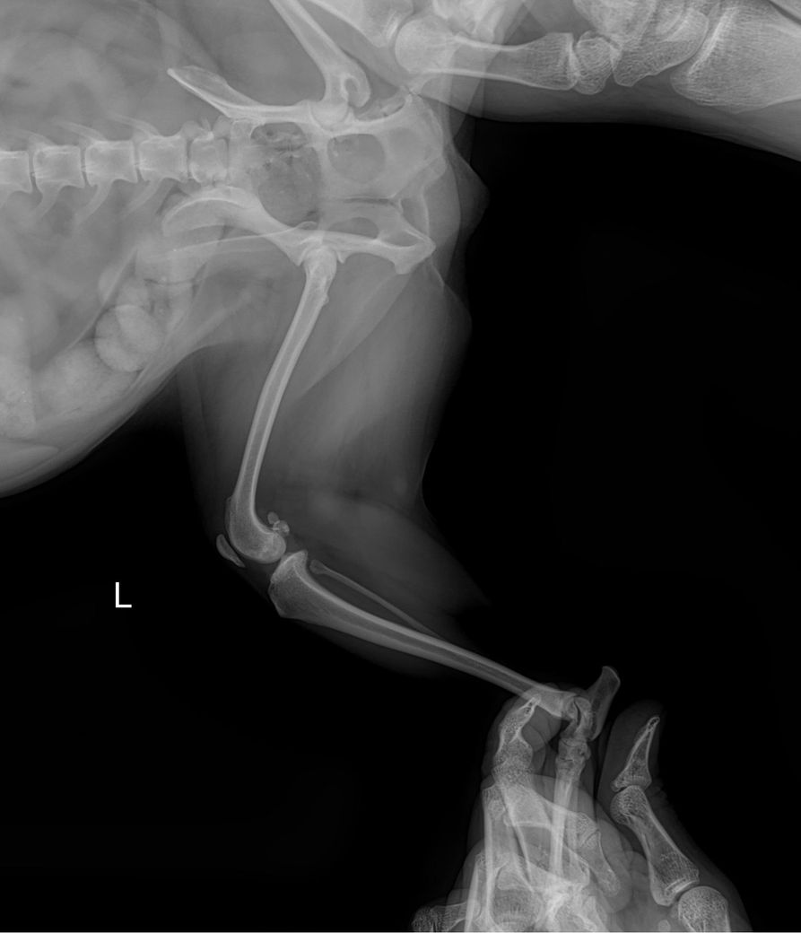 좌측 슬개골이 내측으로 탈구되어 있는 상태이며.