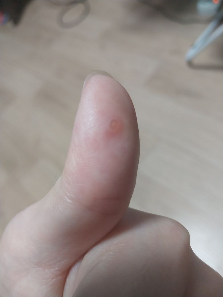 4일전에 엄지손가락 이물감이 들고 따끔거려서 꾹 눌러보니 뭔가 만져졌는데 며칠후엔 저렇게 물집이 올라왔습니다