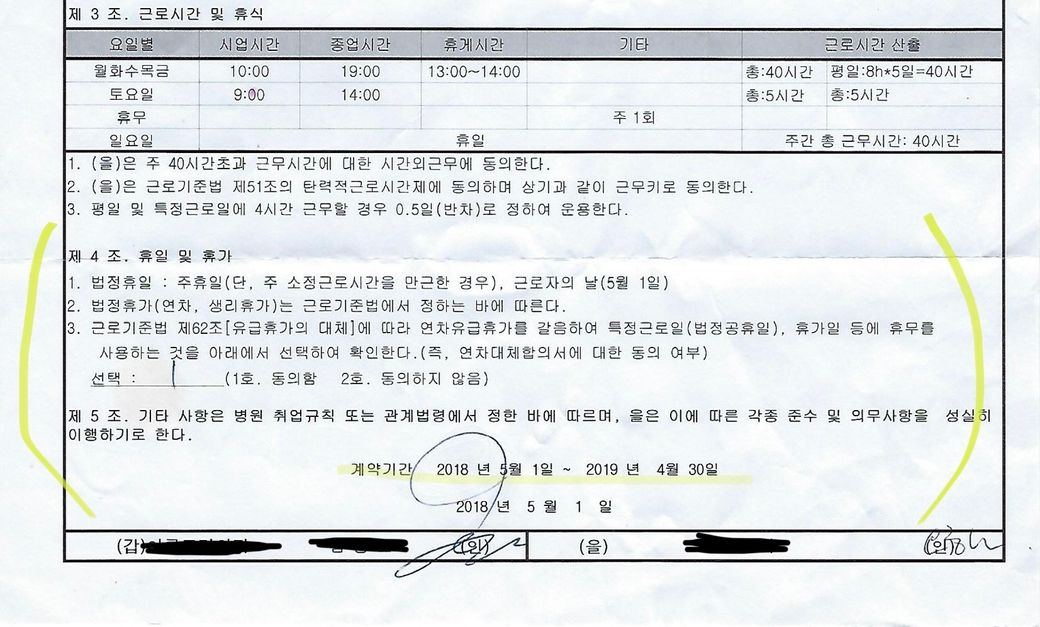 2018년 근로계약서 기준으로 법정휴일 연차로 대체 합의서 동의상태 입니다