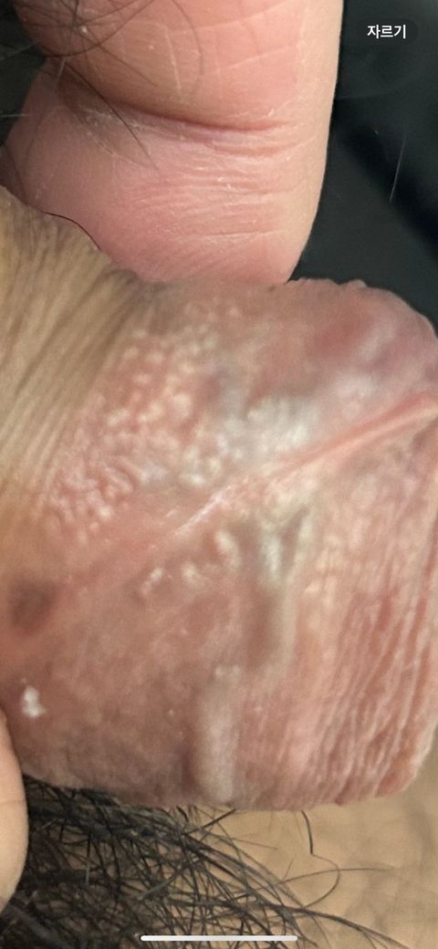 사진에서 보이는 병변은 귀두 표면에 작고 균일한 백색 혹은 황백색 구진들이 다수 분포하는 양상으로 보입니다. 수포가 군집 형태로 모여 있고, 일부가 터지면서 얕은 궤양이나 미란으로 진행하는 전형적인 생식기 헤르페스 병변과는 형태가 다소 다릅니다.