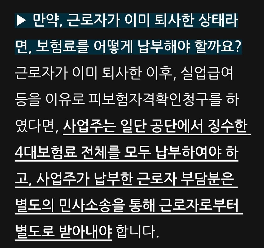 2) 4대보험이 가입되어 있어야 한다면 피보험확인청구를 통해 소급 가입을 할 예정인데 이때 4대보험료는 사업주가 모두 내고 사업주가 근로자에게 민사소송을 통해 받을 수 있다 라고 알고 있는데 이게 맞는건가요? 아니면 그 즉시 반반을 부담해야하는건가요?