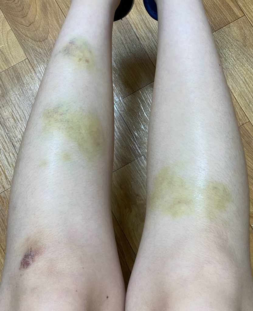 정강이에 여러 군데 멍이 들어서 고생스러우시겠습니다.