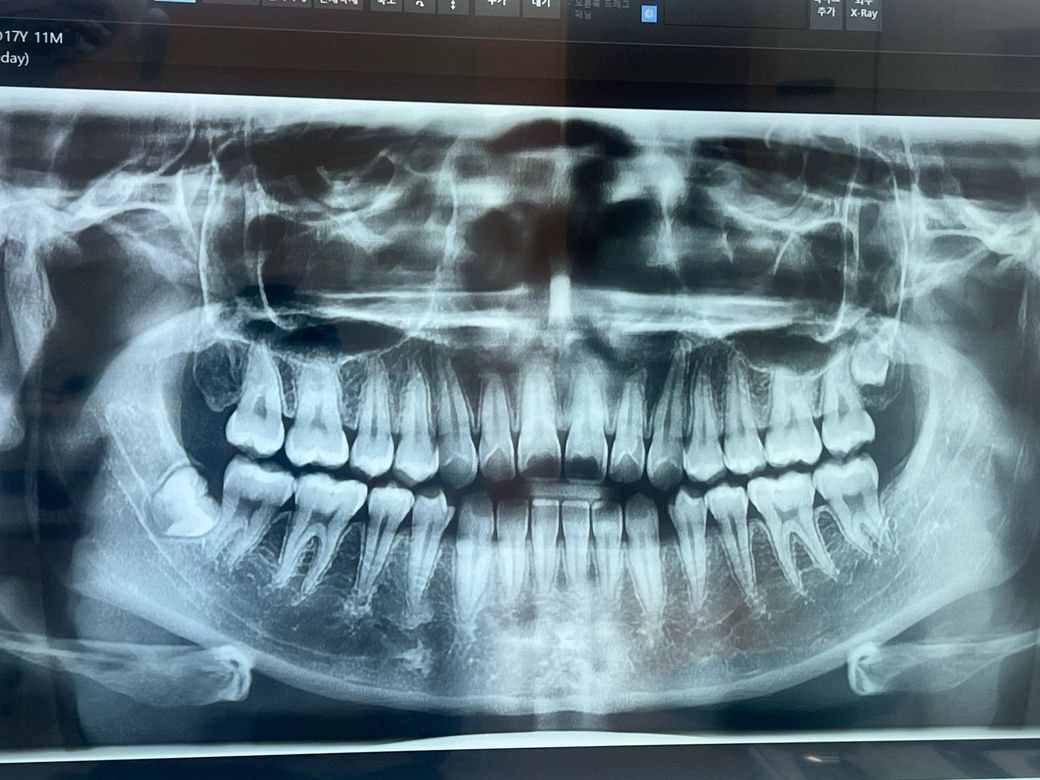 파노라마 엑스레이 사진은 좌우대칭입니다 지금 사진의 사랑니는 실제로는 오른쪽 아래 사랑니입니다