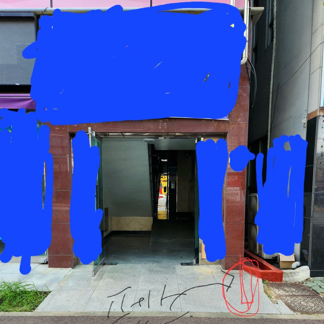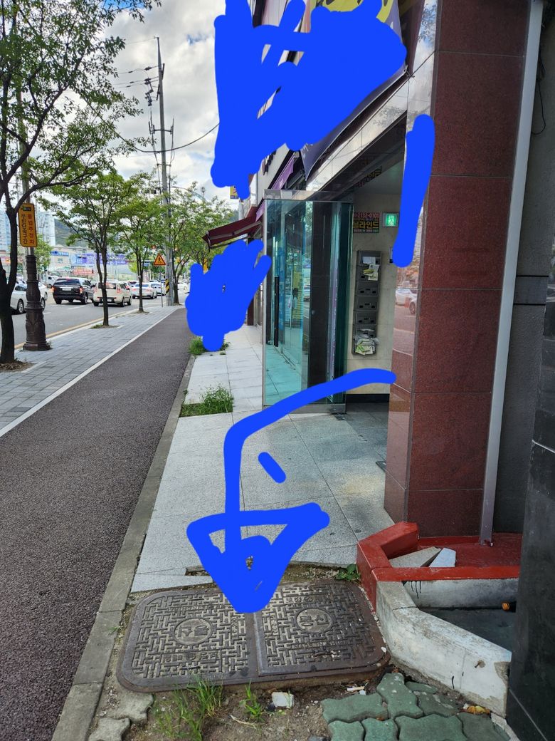 건물입구에서 오른쪽이 바로 저희 상가인데 그림처럼 빨간색부위에 펜스를 설치하여서 통행을 방해하려고하는것같습니다.