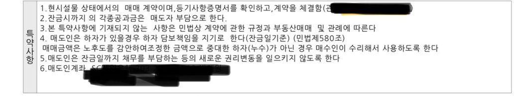특별히 5번 특약은 문제될 여지는 없어보입니다. 일반적으로 잔금일에 잔금지급후 소유권 이전을 하기에 잔금일 이후에는 매도자가 해당 주택에 대해서 별도 권리설정을 할수 없기 떄문입니다. 개인적으로는 특약에서 4번은 매수자 입장에서 조금 리스크가 있어 보이는데, 하자담보문제가 발생하였을때 중대하자를 판단하는데 있어 그 항목에 대한 다툼이 생길수 있는 여지가 있고 약간은 매도인의 하자담보책임의 강도를 낮추는 요인이 될 가능성이 있어 보입니다.