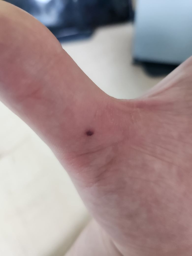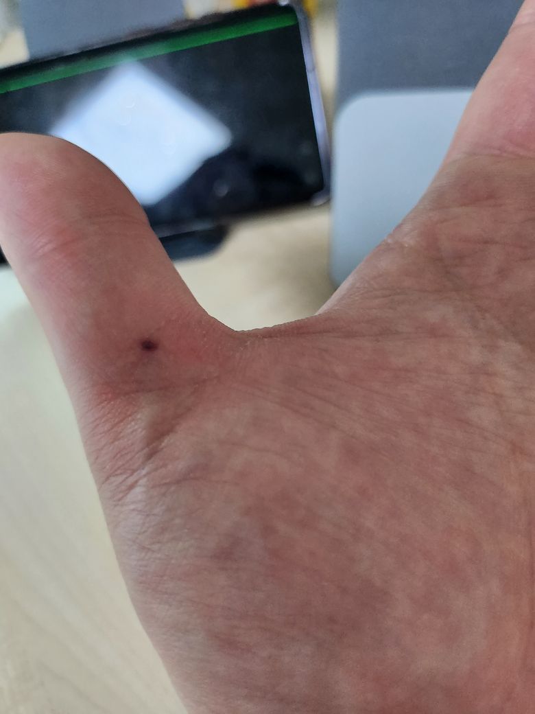 엄지손가락이랑 손바닥 사이에 검정색 뭔가가 생겼어요.