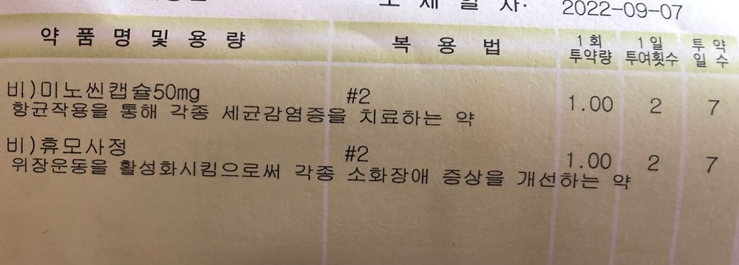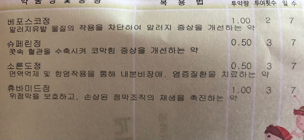 다만 휴모사정은 빼셔도 되니 참고하세요.(위장약이 이미 이비인후과 약에 있기때문)