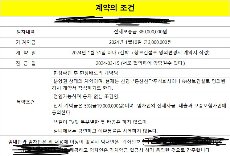 전세계약 도중 파기1월31일 계약서 작성일을 조율하여 잡았으며, 5%인 1900만원 중 300만원 입금 요청 하여 즉시 입금