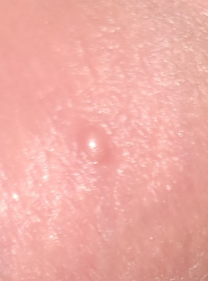 해당병변은 크기가 매우 작아 단순한 뾰루지나 모낭염의 가능성이 있어보입니다. 자연적으로 병변이 치유되는지를 경과 보시고 악화양상을 보인다면 피부과진료를 받아보시기 바랍니다.