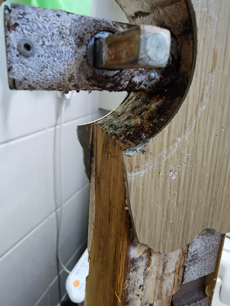 손잡이 교체할때 보니 손잡이 뿐만 아니라 손잡이 타공부위 자체에 녹이 엄청나게 묻어있었습니다. 문짝 자체를 교체하진 않았고 손잡이 심과 손잡이만 교체하고 사용하고 있었는데 금방 다시 뻑뻑해지고 교체한제4달도 되지않아 손잡이가 다시 고장났습니다.