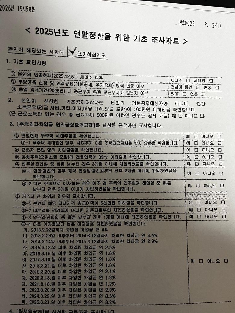 여기까지는 했는데 밑에 저기 3.주택임차차입금 원리금상환액공제를 신청한 근로자만 표시합니다. 이하의 박스들은 뭘로 체크를해야할지 몰라서! 참고로 2025년도 1.1~12.26 까지는 기존 전세유지했었고, 2025년 12.26자로 전세가 한번 갱신되었긴 한데 이것도 뭔가 영향을 주어서 체크를 해야할지 종합적으로 여쭙고 싶습니다 ㅠㅠ